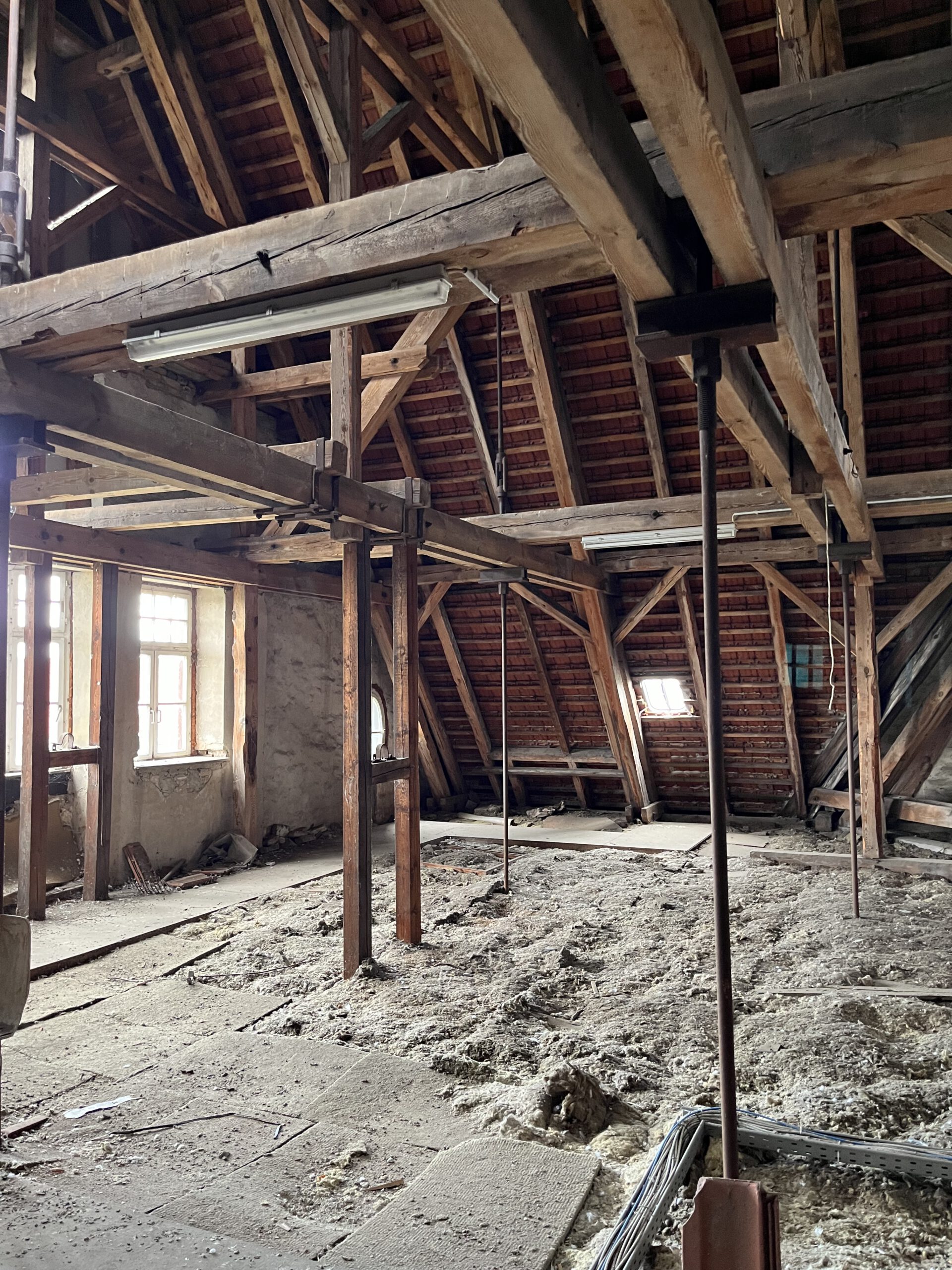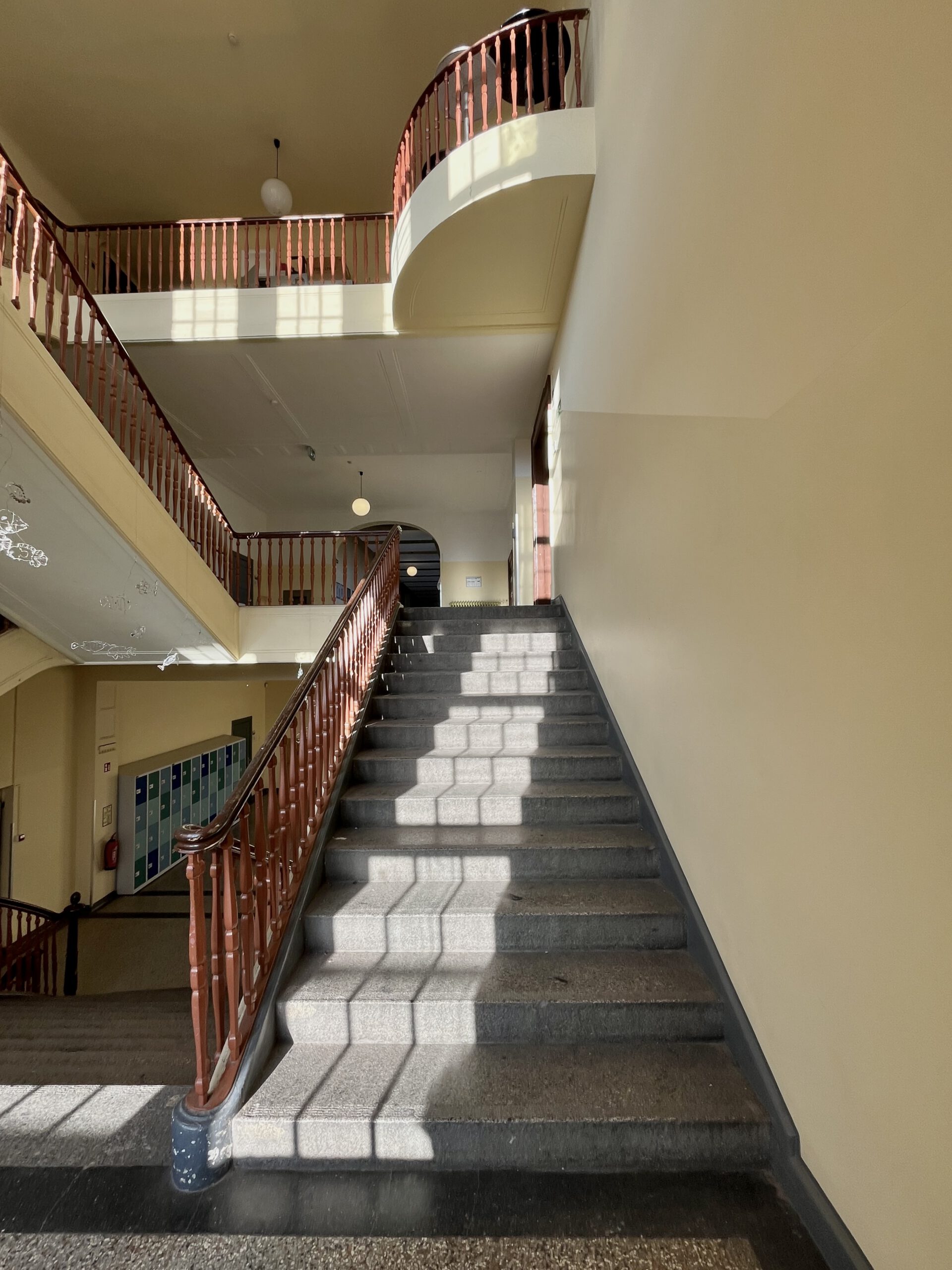 Begleitend werden Putz- und Malerarbeiten, die Aufarbeitung der historischen Holztüren, Fenster, Terrazzoböden und Treppengeländer sowie Schallschutzmaßnahmen umgesetzt. Die technischen Anlagen – Alarmierungs-, Rauchabzugs- und Beleuchtungssysteme – werden überprüft, angepasst und in Teilen erneuert.